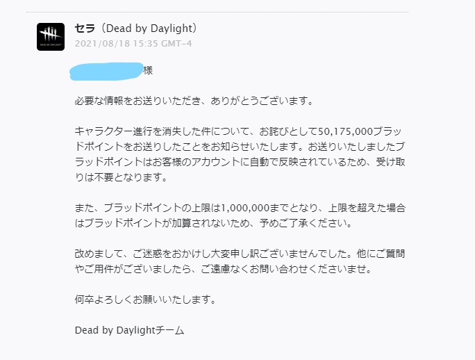 俺がバッシュだ Pc版dbdセーブデータ消失バグですが 運営やっぱりクソ対応でワロタw プレイ時間800時間未満なので5000万bpしか補填無いみたいですね 使用したbpは2億は超えるので完全に泣き寝入りっすわ Dbd T Co Ogclz7iq Twitter